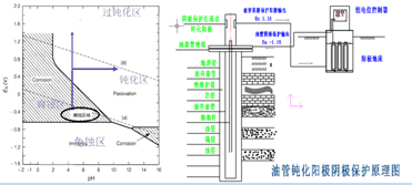 實(shí)施方法是用恒電位儀中的保護(hù)電路,控制由油管桿和套管構(gòu)成的宏觀(guān)陰極保護(hù)電路,管道是陰極保護(hù)的負(fù)極收到保護(hù),鈍化陽(yáng)極安裝在液體中形成一個(gè)保護(hù)回路。在這個(gè)防腐電池場(chǎng)中管道作為陰極得到保護(hù),鈍化陽(yáng)極成為消耗材料。