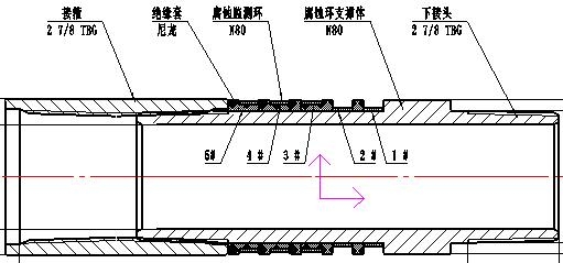 油管腐蝕監(jiān)測掛環(huán)器結(jié)構(gòu)主要有由掛環(huán)器支撐體、自然腐蝕監(jiān)測環(huán)、管體等電位監(jiān)測環(huán)、絕緣組件、上下接頭石油專用管螺紋等組成。